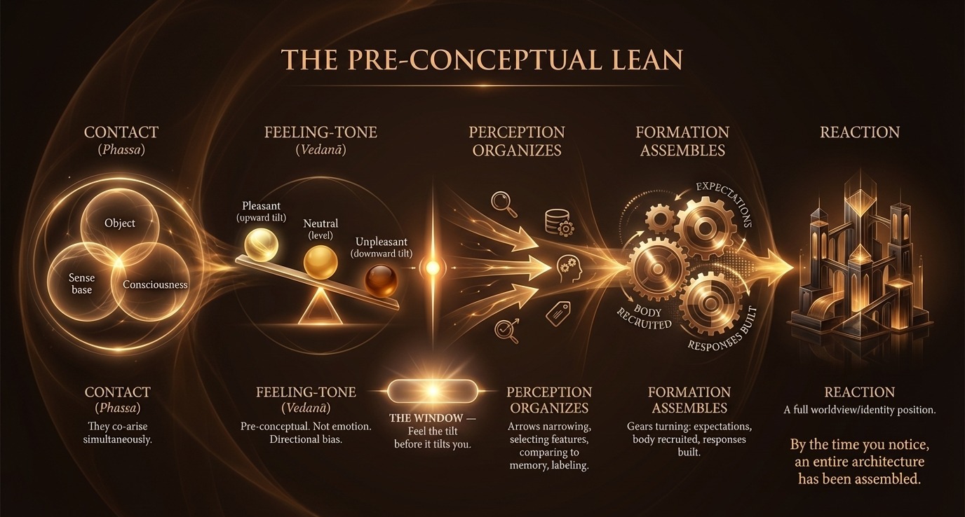Vedanā is not emotion. It is the pre-conceptual registration of valence — whether this moment of contact carries a pleasant, unpleasant, or neutral quality. Pleasant is not good. Unpleasant is not bad. Neutral is not irrelevant. These are not moral categories. They are directional biases — the way the field tilts before any interpretation arrives.