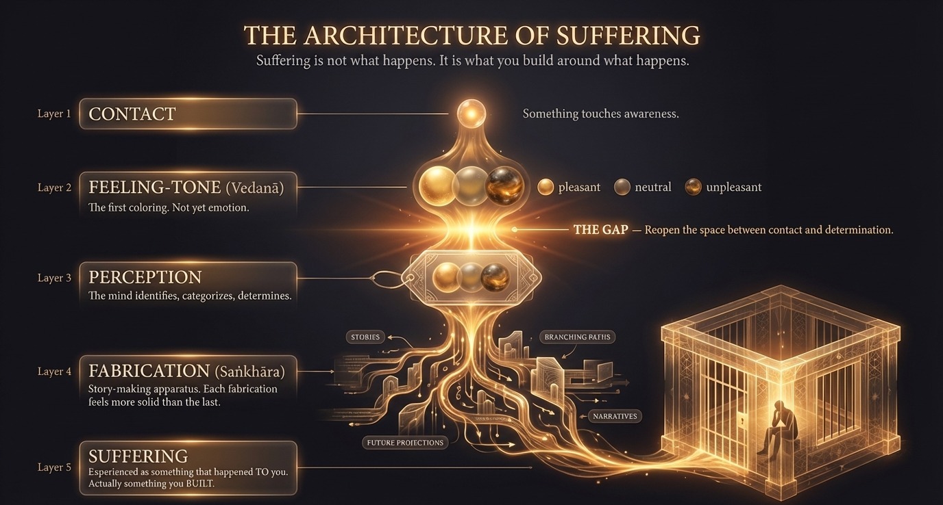 The suffering you feel — the anxiety, the narrative of abandonment — was not caused by your friend's silence. It was generated by the mechanism that converts contact into feeling-tone, feeling-tone into perception, perception into fabrication, and fabrication into a lived world you experience as if it were simply what happened.