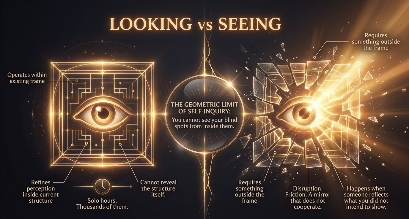 Self-inquiry has a structural limit, and it is not about effort or sincerity. It is about geometry. You cannot see your own blind spots from inside them.