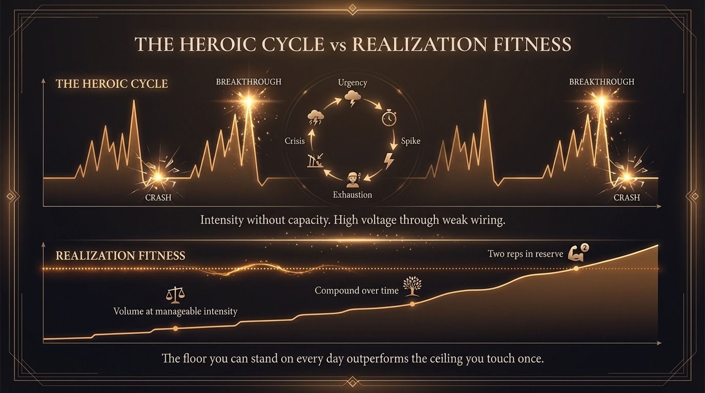 Two reps in reserve. Zone two training. Twenty minutes daily instead of ninety minutes twice a week. The instruction sounds almost insultingly simple. But simplicity is the point. The heroic cycle mistakes the ceiling for the training. Realization fitness trains the floor.