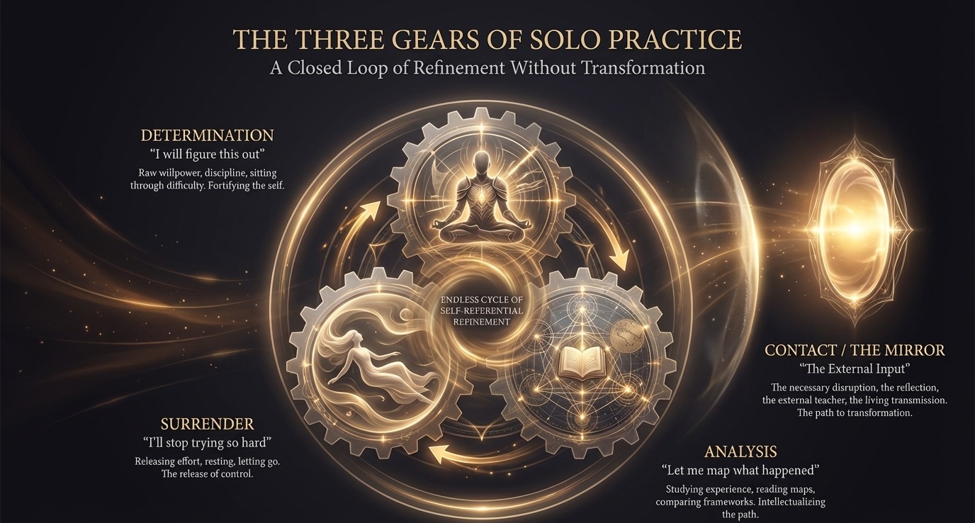 This is not a metaphor for weakness. It is a description of how self-referential systems work. Without an external mirror -- a teacher, a co-practitioner, a container that introduces genuine friction -- your practice optimizes within its current structure. You get more articulate about your patterns. You develop better vocabulary for the loop. But the loop does not break.