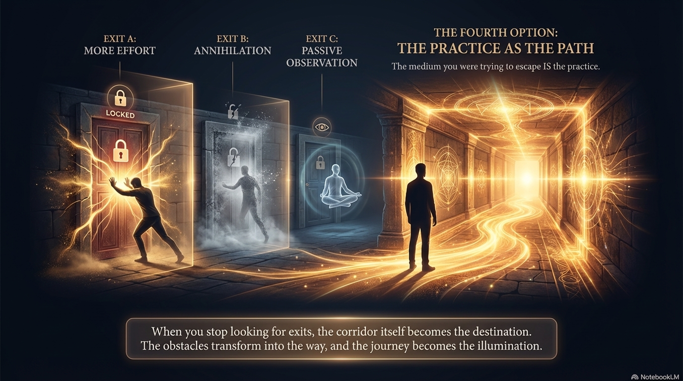 Most practitioners spend years rotating between the three exits -- trying harder, then transcending, then passively observing, then trying harder again -- without ever noticing that the rotation itself is the trap. The Fourth Option begins the moment you stop reaching for exits and start asking a different question entirely: what is actually here, right now, if I stop trying to make it different?