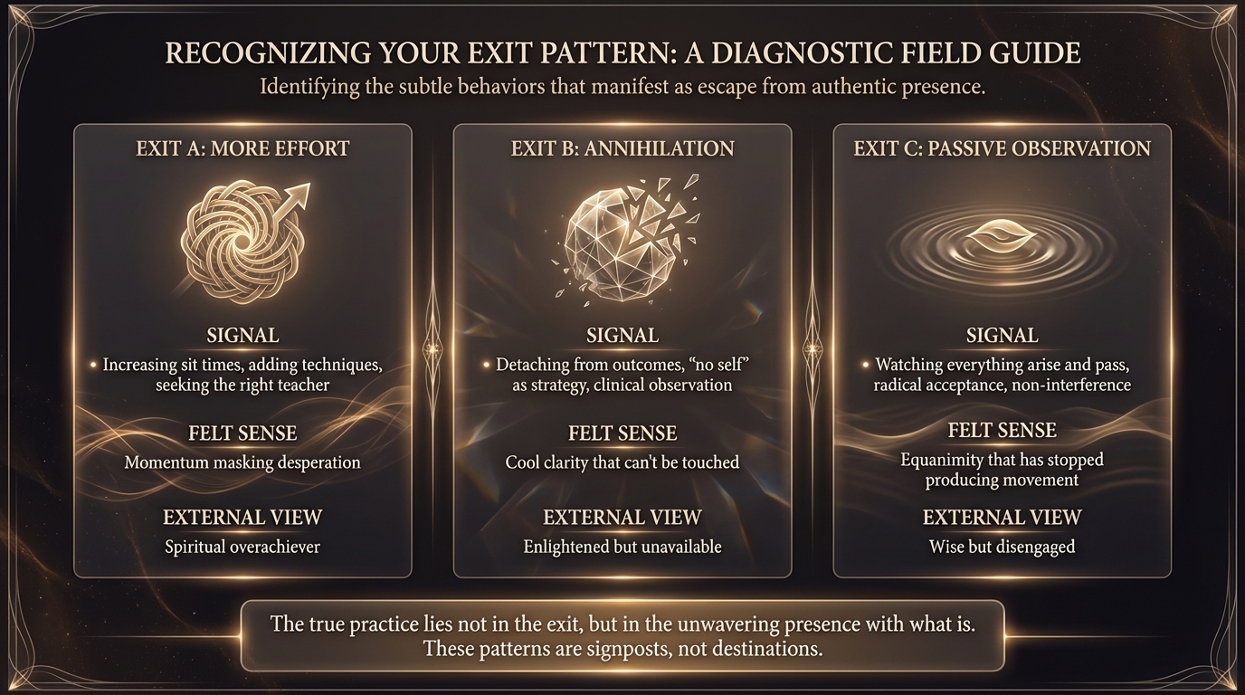 Exit C is seductive because it requires nothing. No effort, no confrontation, no risk. The practitioner becomes a spectator of their own inner life -- present in a technical sense, but never actually participating. Difficulty is tolerated rather than met. The practice has the surface of equanimity and the substance of avoidance.