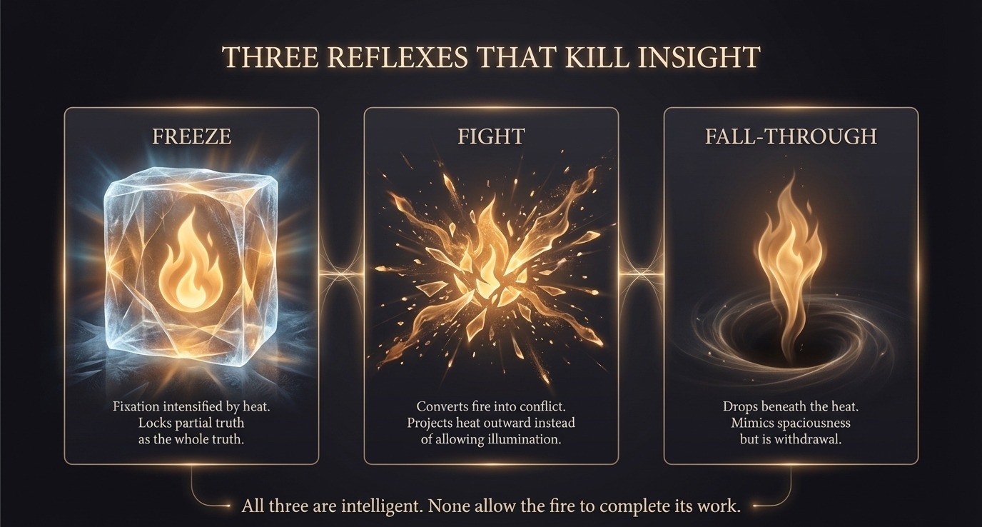 Freeze preserves continuity by arresting movement. Fight preserves it by forcing alignment. Fall-through preserves it by disengaging significance. All three are intelligent. None of them allow the fire to complete its work. They manage the heat but do not clarify the structure.