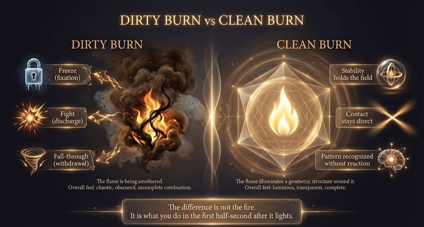 But the quality of the burn depends on the quality of the fuel. When the fuel is pure — when the system can remain present with what is being revealed — the burn is clean. Light without obscuration. When the fuel contains impurities — the structures the appropriating mind has bent to preserve identity — the burn is dirty. Smoke, obscured vision. Eventually the fire suffocates itself.