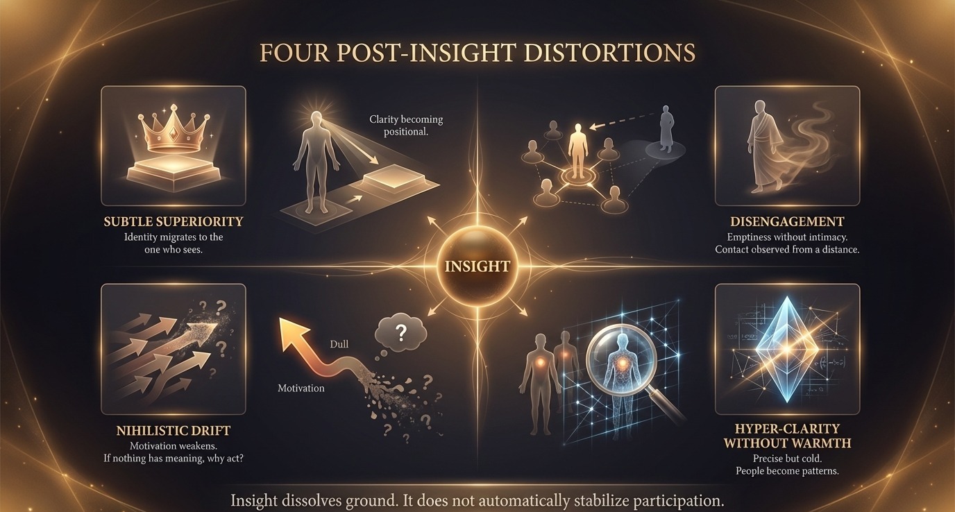 What all four distortions share is the same root: insight dissolves conceptual ground, but insight alone does not stabilize participation.