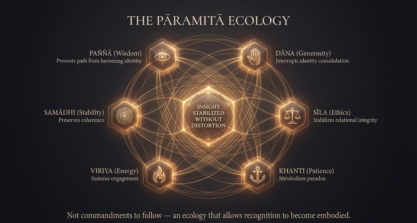 The pāramitās — the perfections — are not a checklist. They function as an ecology, each one addressing a specific distortion that arises when insight meets conditioning that has not yet caught up.