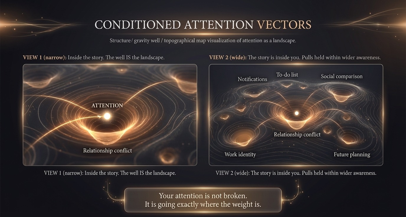 Attention does not wander randomly. It moves along conditioned vectors — grooves carved by years of reinforcement, preference, avoidance, and desire. When you sit down and your mind lurches toward your to-do list, that is not a failure of concentration. It is the gravitational pull of a deeply conditioned pattern expressing itself.